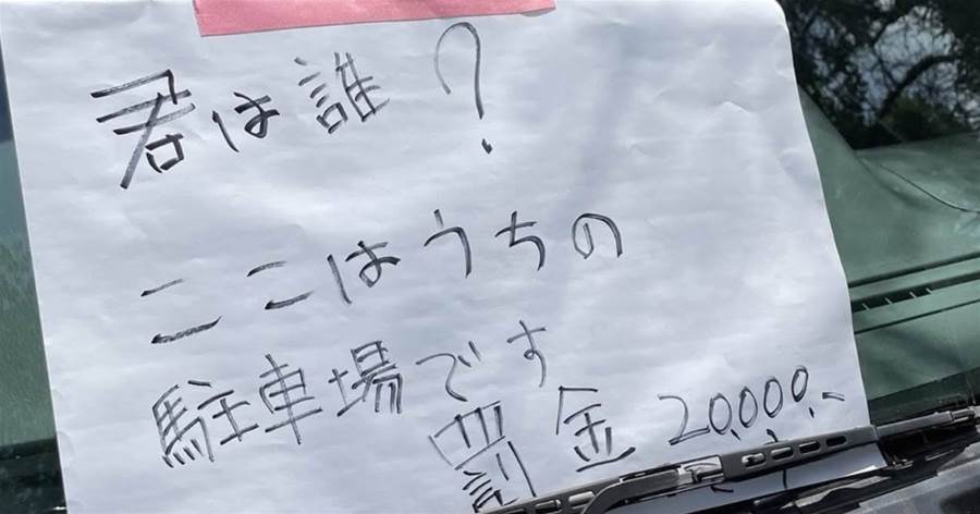 フロントガラスに、ピンクテープで貼られた紙。「君は誰? ここはウチの駐車場です。罰金20,000円」。