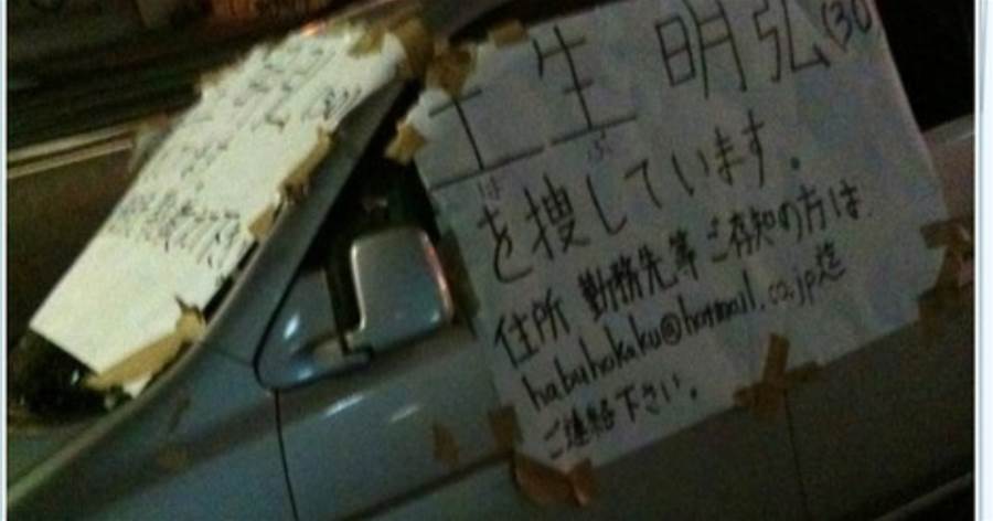 フロントガラスから屋根にかけて、大きな手書きの紙がびっしりと貼られている。