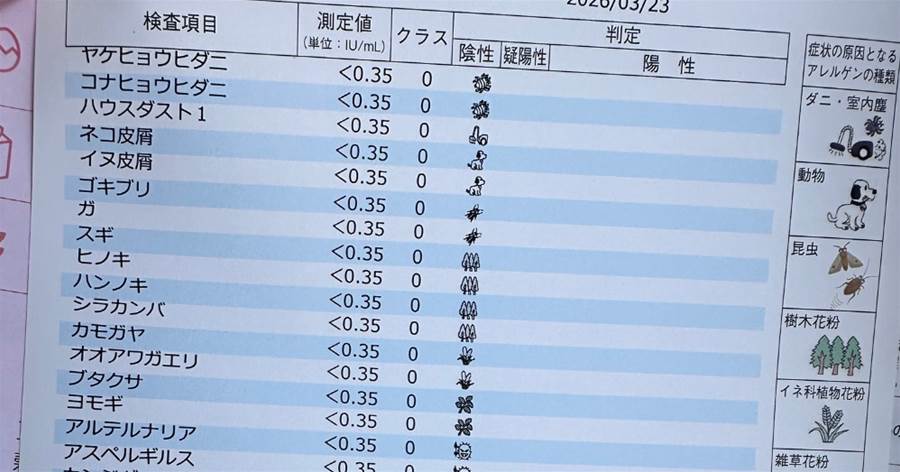花粉もダニも動物もカビも食べ物も、見事なくらい何も引っかかっていない。