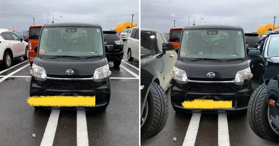 1台だけ、堂々と白線をまたいで停めている軽自動車。