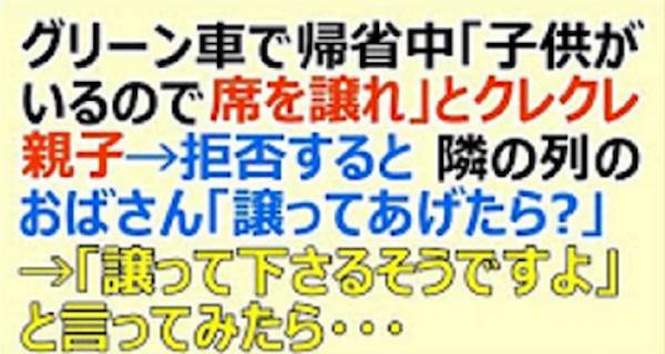 ・いくら子供がいるからとは言ってもね、ちゃんとルールは守ったほうがいいね。子供をダシにして無理難題を言ってくるのが一番に質が悪いんだからさ。・子連れでお盆の時期の新幹線を使うなら、早めに指定席を予約しとかなきゃいかんでしょ。これは親が悪い。おばさんも自分ができないことを人に押し付けるもんじゃないよ。