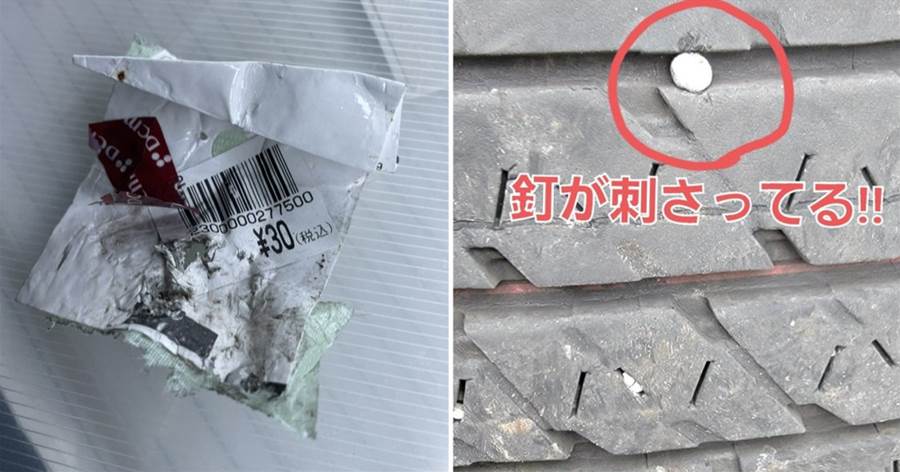 手を伸ばすと、粘着テープで逆さまの釘がタイヤに固定されていた。