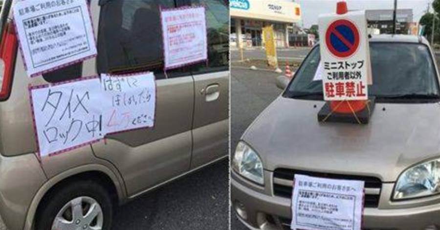 タイヤには赤いロックがかけられ、車体には手書きの警告紙が何枚も貼られている。