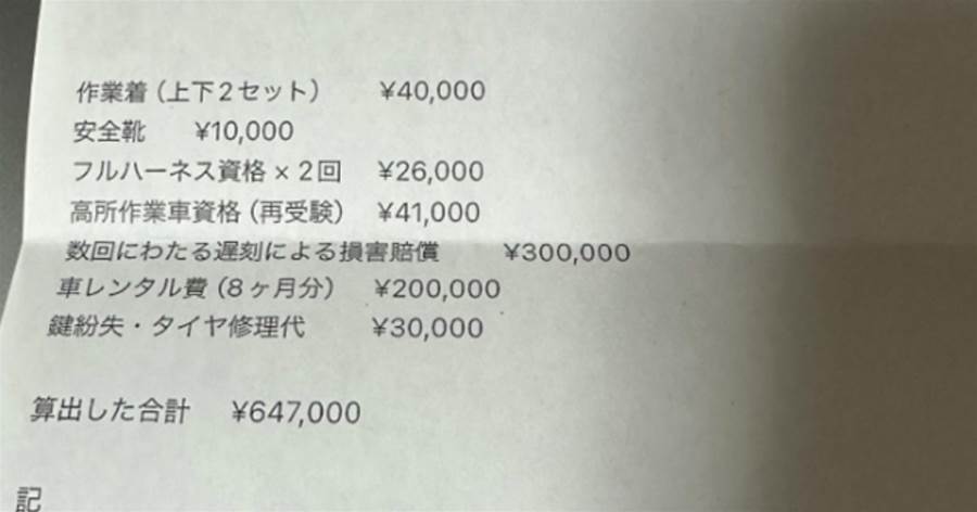 作業着・安全靴・資格費用・車のレンタル代・遅刻の損害……みたいな名目が並んで、合計がそれなりの額。