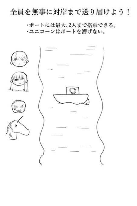 ・状況:到着した瞬間は3人いるので安全です。ここでたかし君が戻るのがポイントです。お姉さんとユニコーンが対岸に残りますが、ユニコーンは女性(お姉さん)に対しては攻撃的ではないため、安全です。
