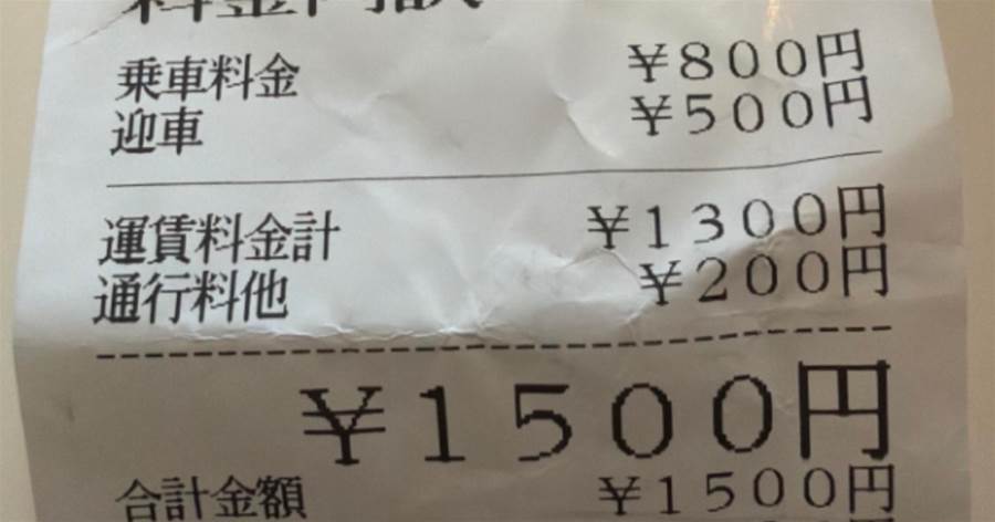 乗車料金 800円。迎車 500円。通行料他 200円。合計 1500円。
