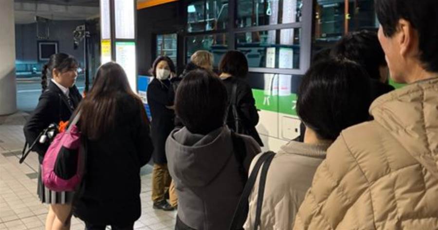 夜のバス停に、さっきまで車内にいた人たちが並ぶ。