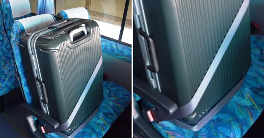 前の座席に置かれた緑色の特大スーツケース――座席2つ分を占拠しており、しかも安全帯まで巻かれてしっかり固定されている。