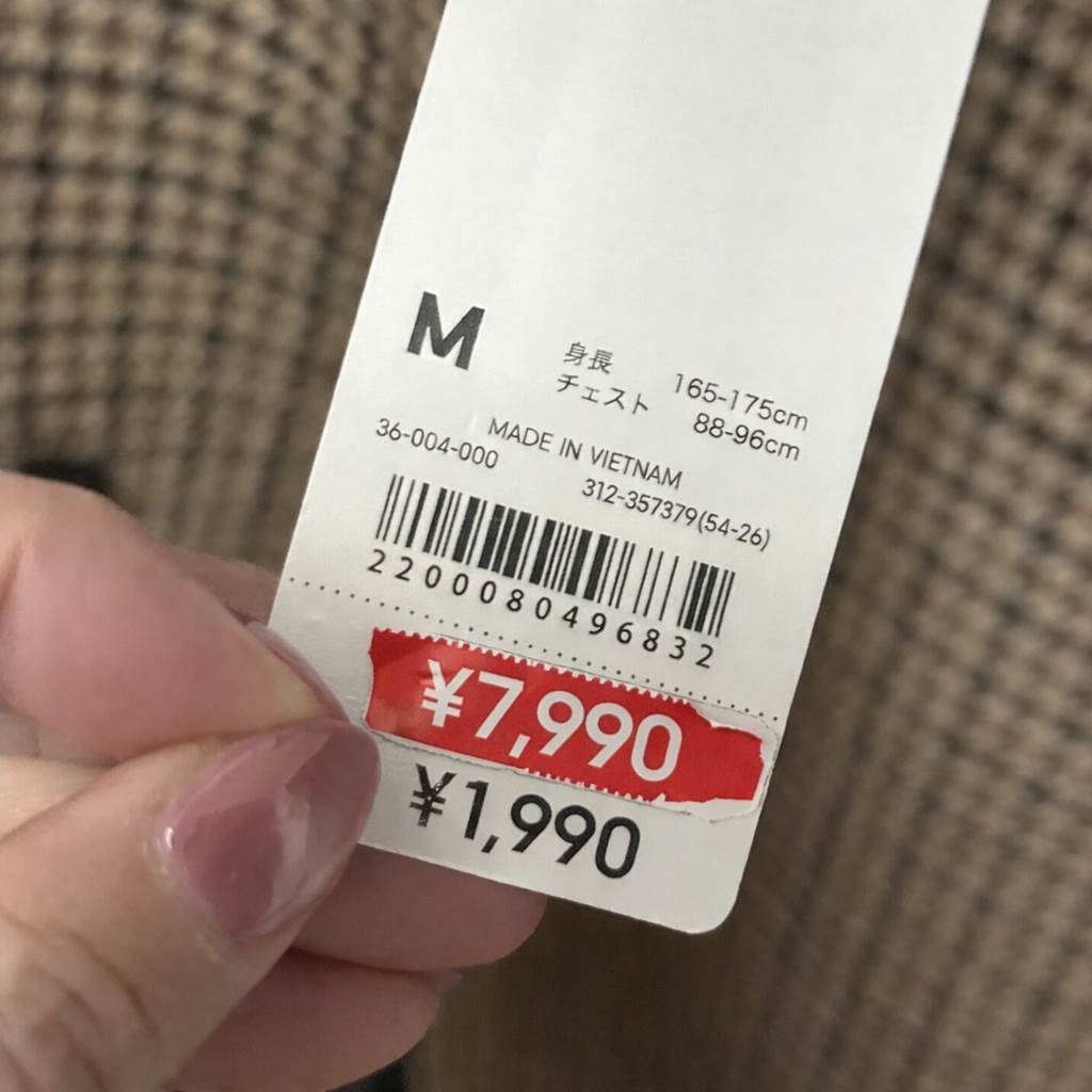 そして、その日はGUで理想的な外套を見つけました。タグには「7990円のセール価格」と書かれていて、私は心の中で「やったー、ついに欲しかったやつが安くなってる!」と思い込んでました。でもね、どんなにお得そうに見えても、私は必ずセールタグを剥がして確認する習慣があるんです。