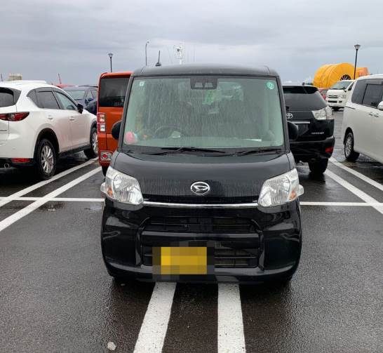 買い物から帰ってきて、またすぐ出かける予定だったから、いったん4台分のスペースのど真ん中に、斜めに停めた。