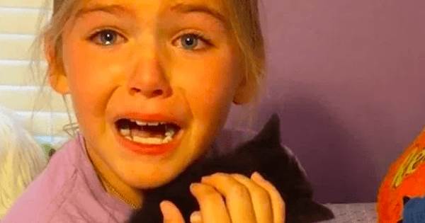 女の子は嬉し泣きをしながら子猫を胸に抱き、