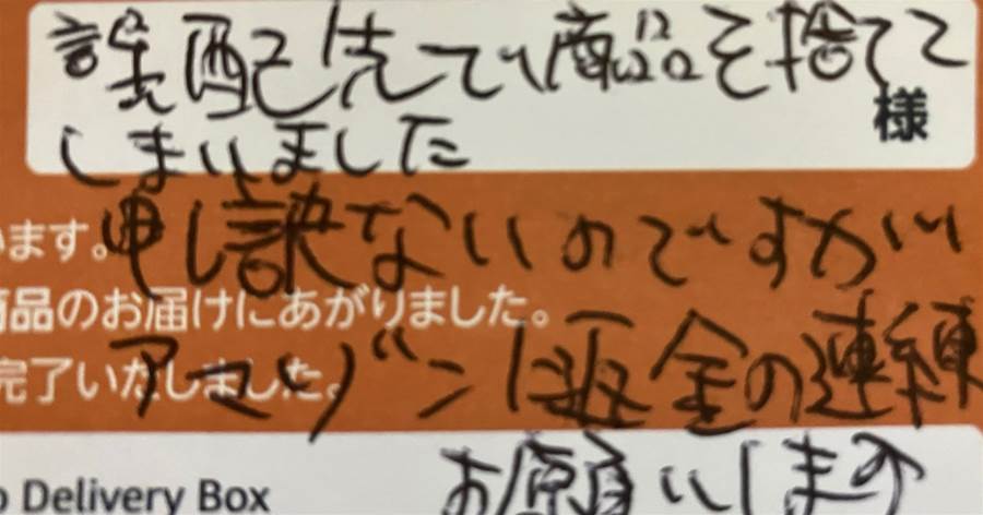 「配達先で商品を捨ててしまいました。申し訳ないのですが、アマゾン様全の連絡をお願いいたします。」
